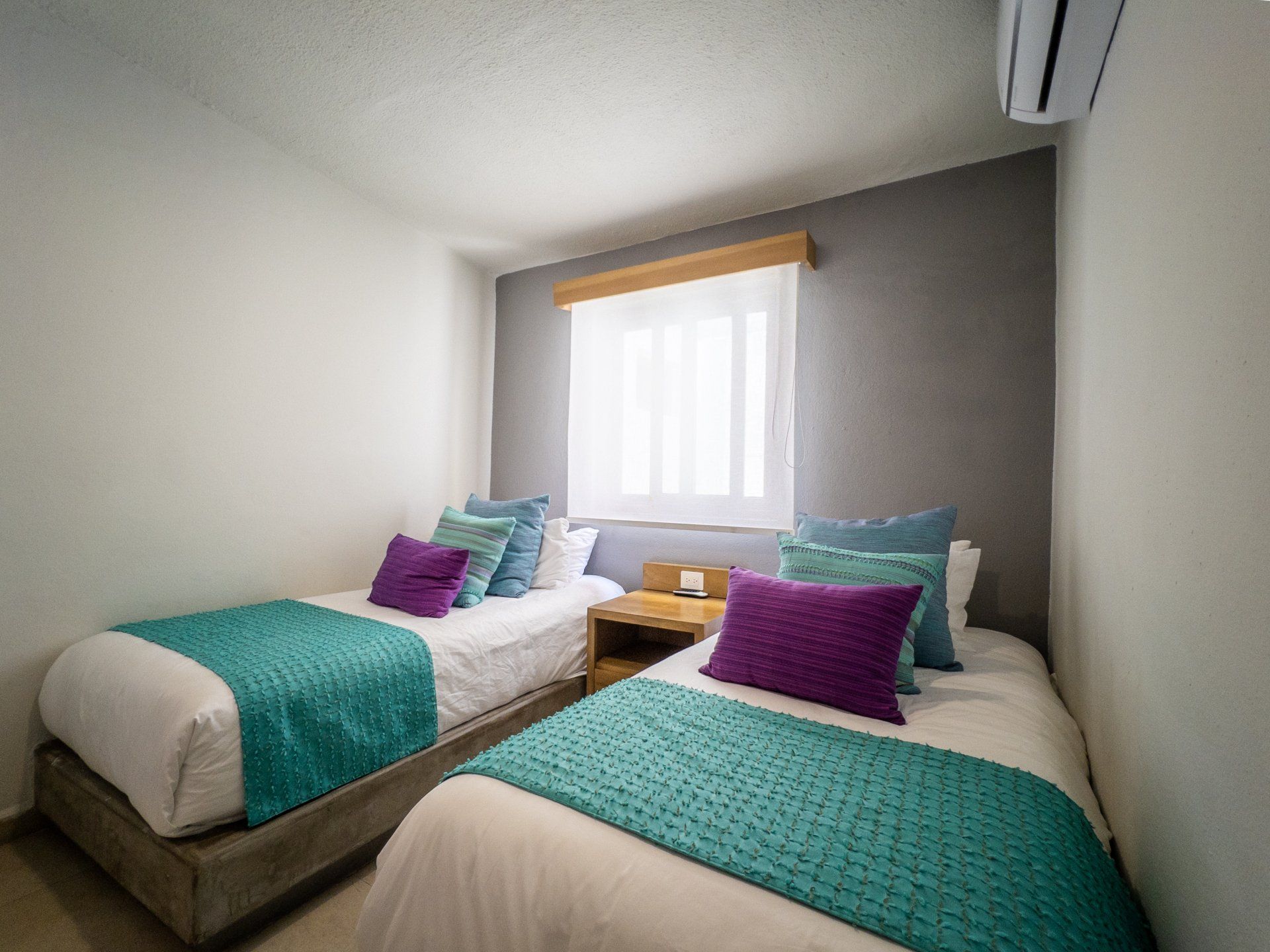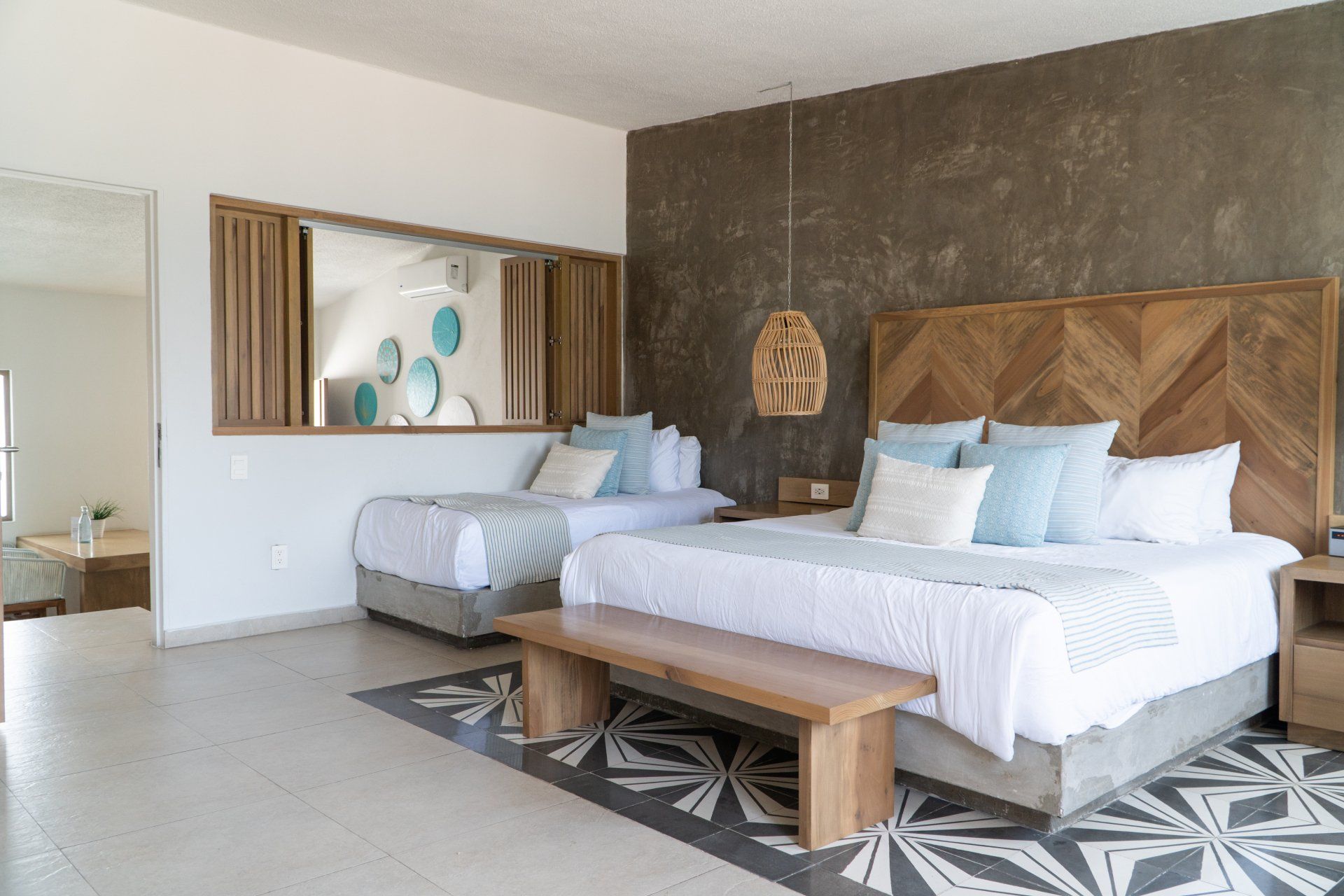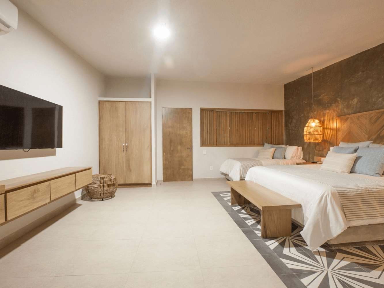 La más amplia y confortable de nuestras suites, tiene capacidad máxima para 4 personas. Son 2 habitaciones cuidadosamente diseñadas para su confort, la principal cuenta con una cama King size y la secundaria con cama Queen size, o bien dos camas individuales. Tenemos a tu disposición 5 suites, 2 con camas Queen y 3 con camas individuales.