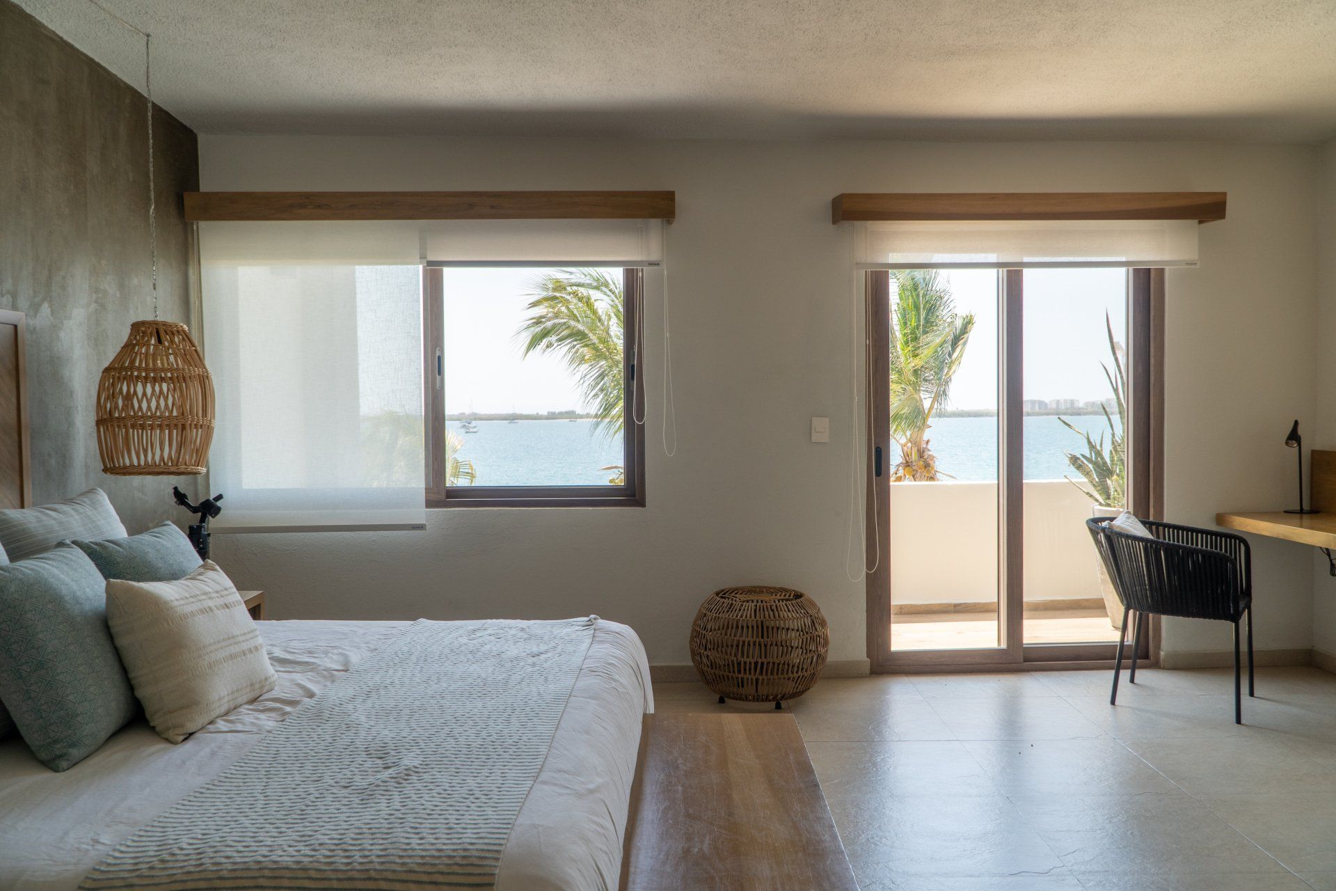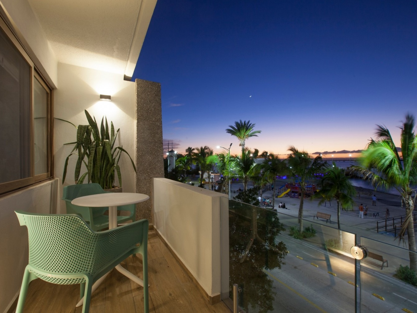 Suite con capacidad para 3 o 4 personas, habitación con terraza y espectacular vista a la bahía de La Paz, perfecta para ver los mágicos atardeceres. Cuenta con una cama *King size más 1 cama individual, o 2 camas Queen size. Tenemos a tu disposición 3 suites de este tipo, 2 de ellas con cama King size y otra con 2 camas Queen size. Esta suite para su comodidad tiene 60 m2.